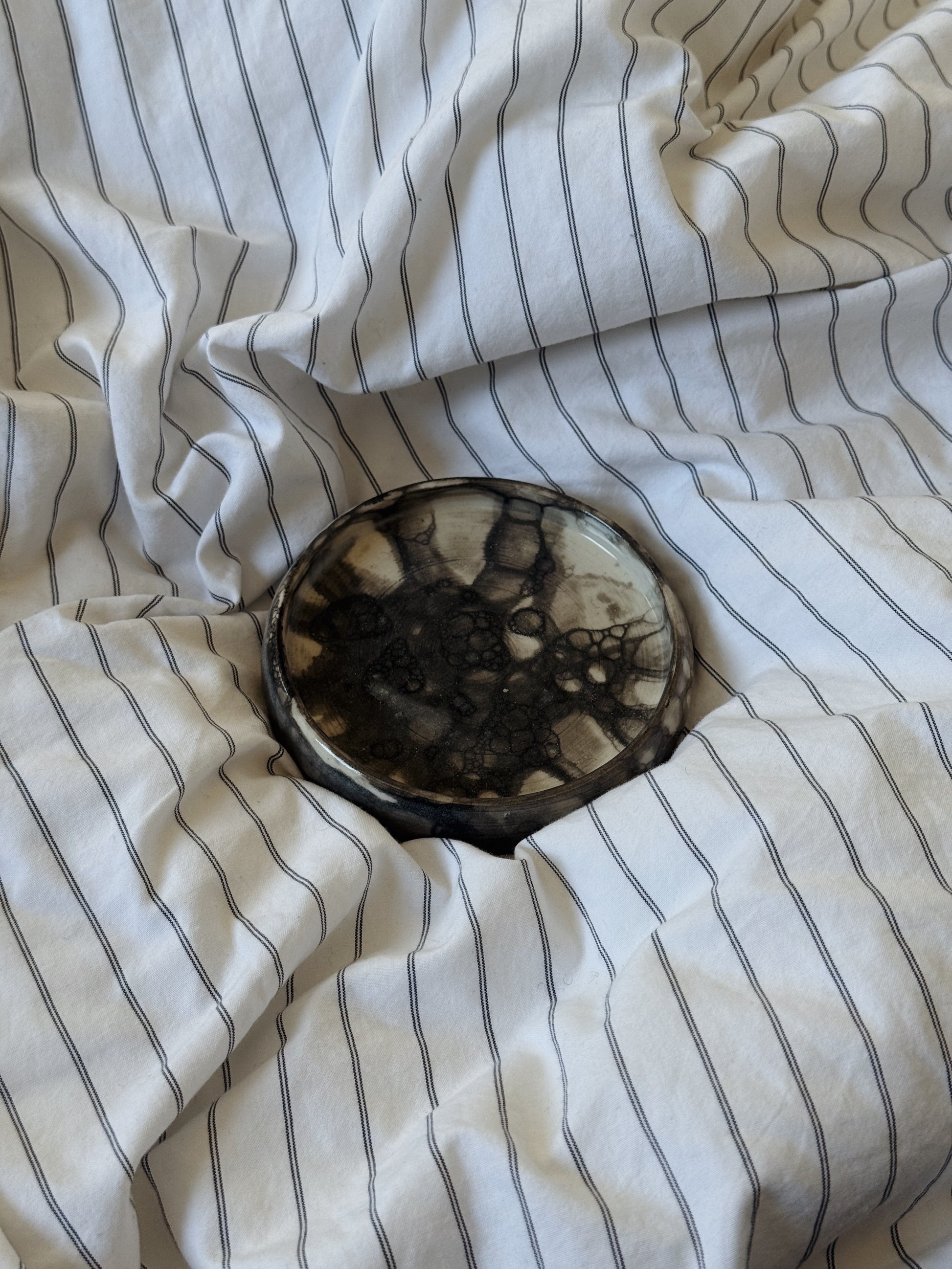 A handcrafted coaster featuring the same smoky bubble glaze as the dish. Its dramatic, dark pattern adds a striking, modern touch to your tabletop while protecting surfaces