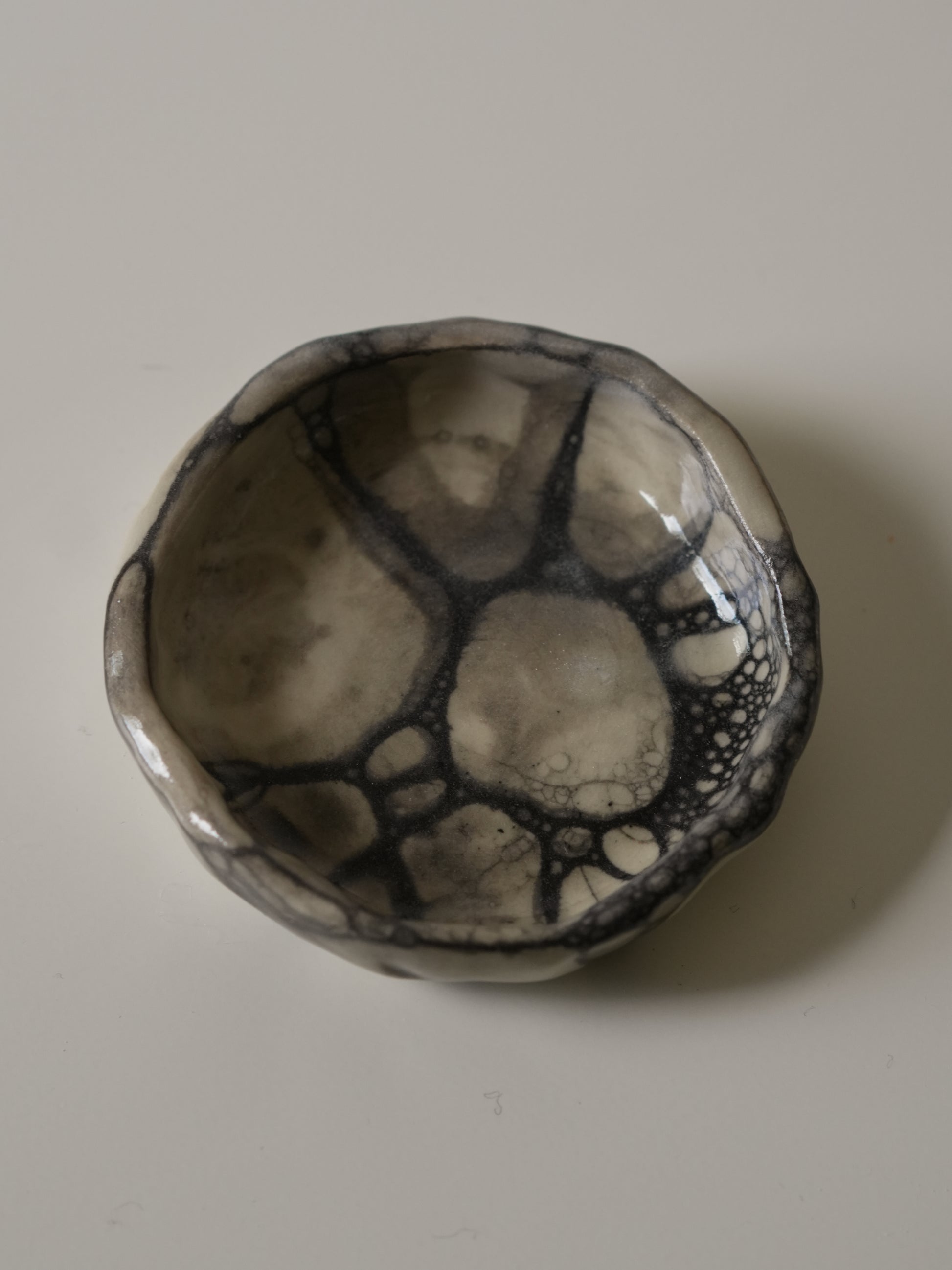A mini trinket dish glazed with a mesmerising smoky bubble effect. Its dark, swirling pattern creates a moody, artistic vibe while keeping rings, earrings, or tiny treasures neatly organised.