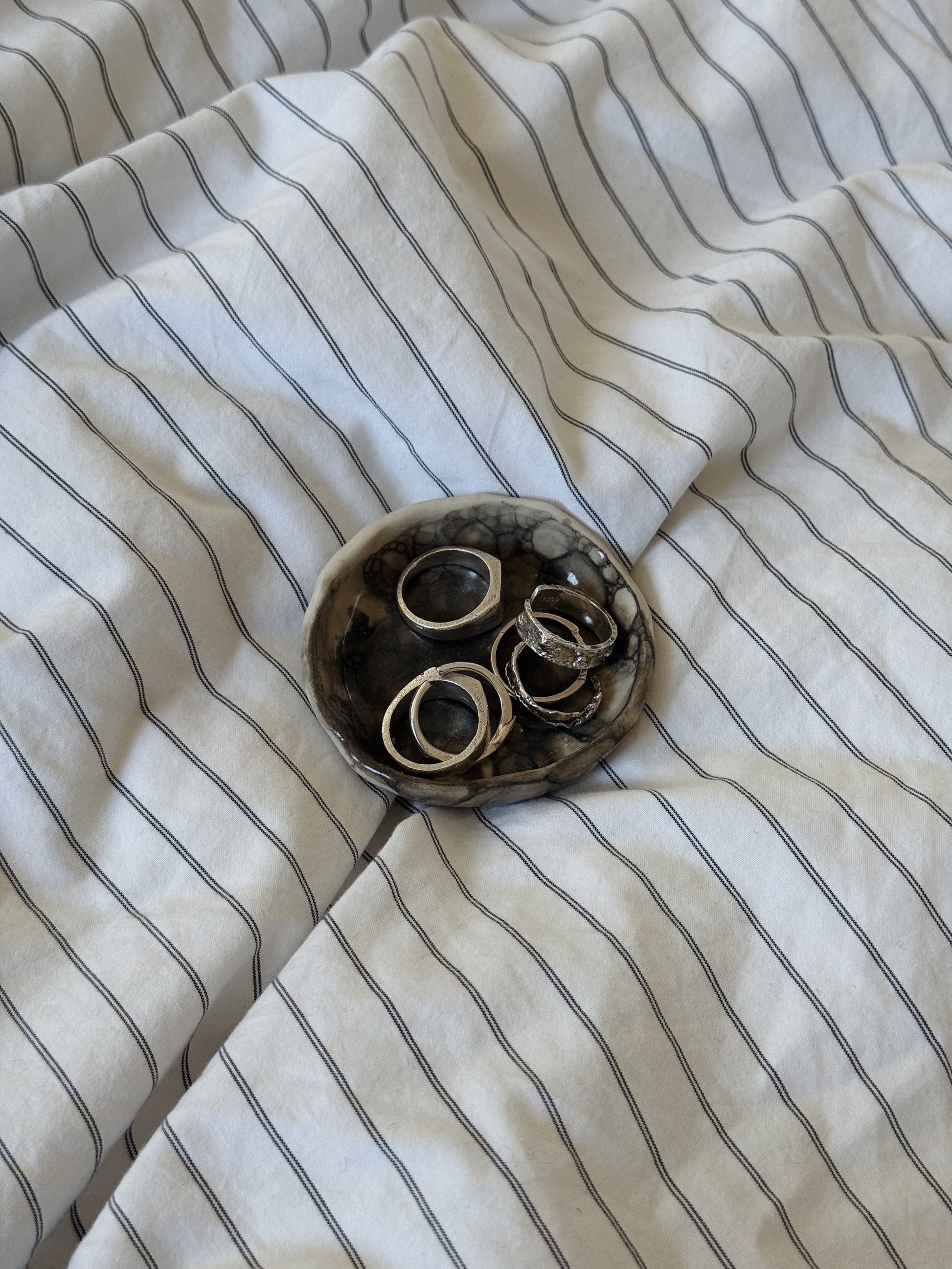 A mini trinket dish glazed with a mesmerising smoky bubble effect. Its dark, swirling pattern creates a moody, artistic vibe while keeping rings, earrings, or tiny treasures neatly organised.