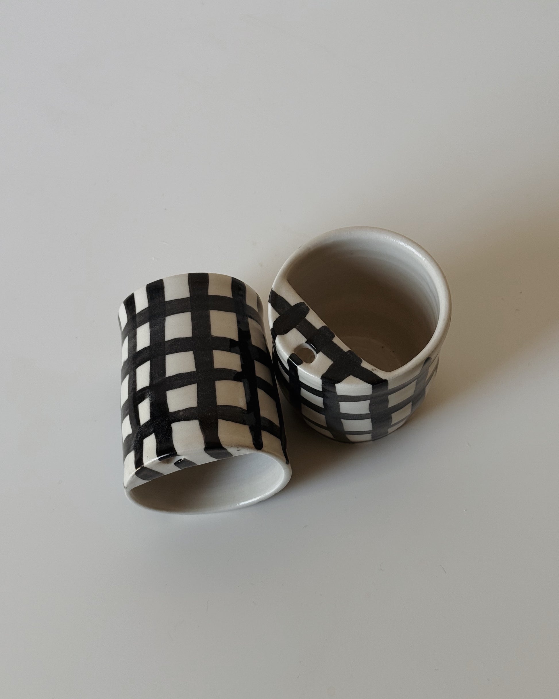 The Grid Keep Cup features bold, solid horizontal and vertical stripes that intersect to create a striking, graphic grid pattern. Its strong, modern design makes it a standout piece for those who appreciate bold, handmade artistry in their daily coffee ritual.