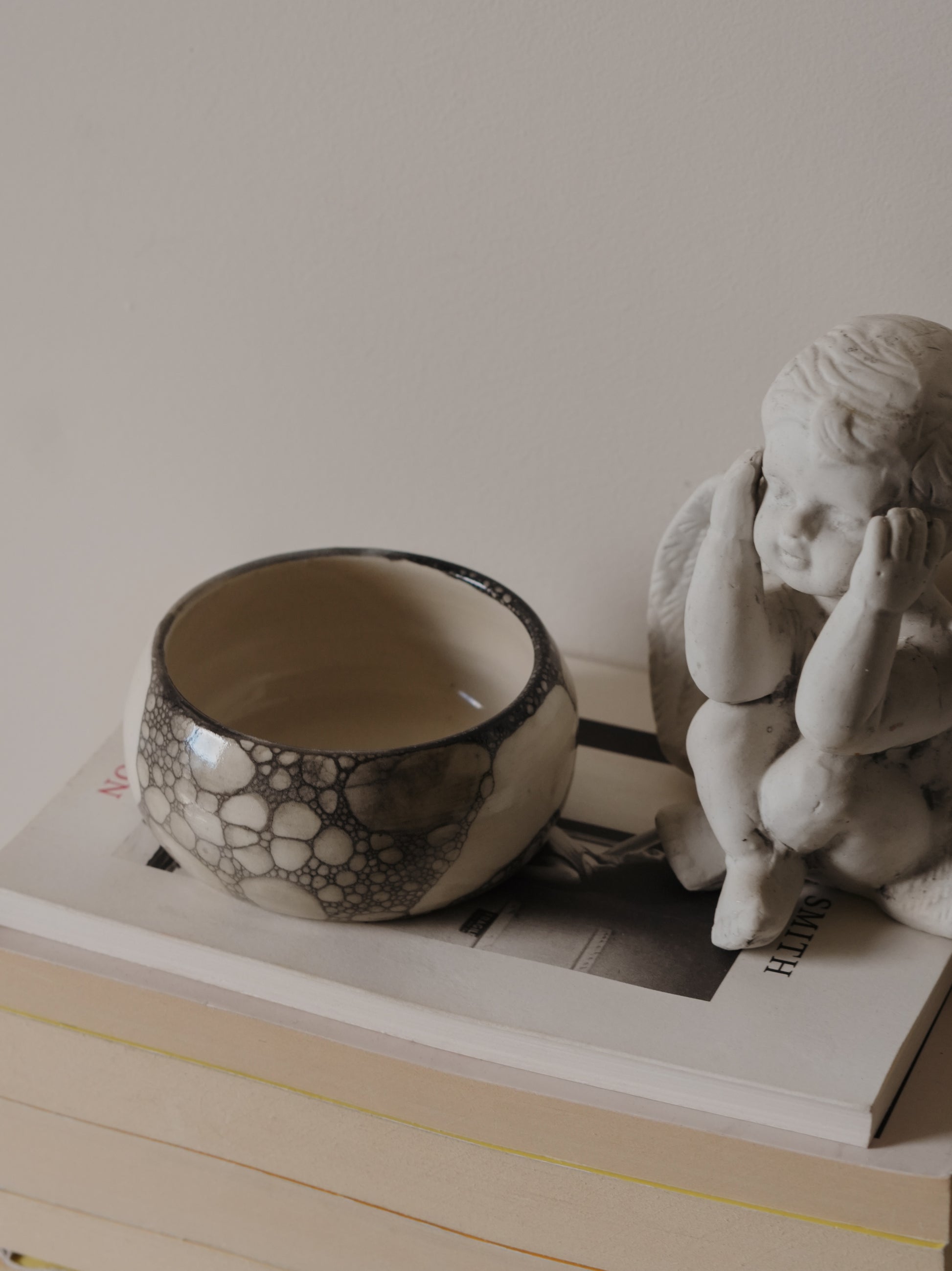 A small ceramic bowl glazed with a soft bubble pattern in smoky charcoal tones. Its organic, cloud-like design brings an artistic, moody touch to any space while keeping rings, earrings, or tiny treasures beautifully gathered.