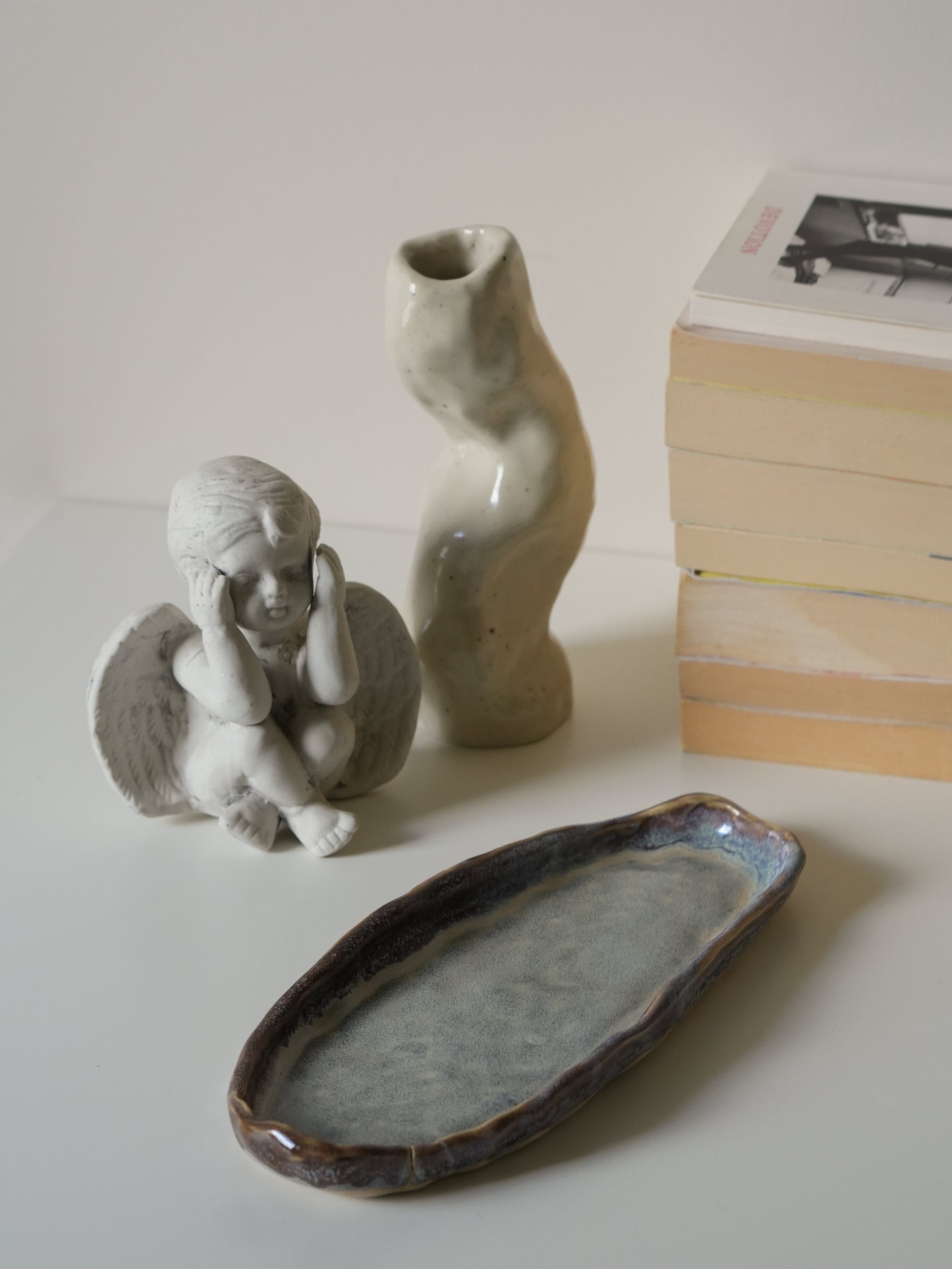 The Ocean Eyes trinket dish captures the tranquil beauty of the sea with its flowing blue and beige glaze. Its large oval shape makes it perfect for holding jewellery, keys, or other small treasures, bringing a calming coastal touch to any space.