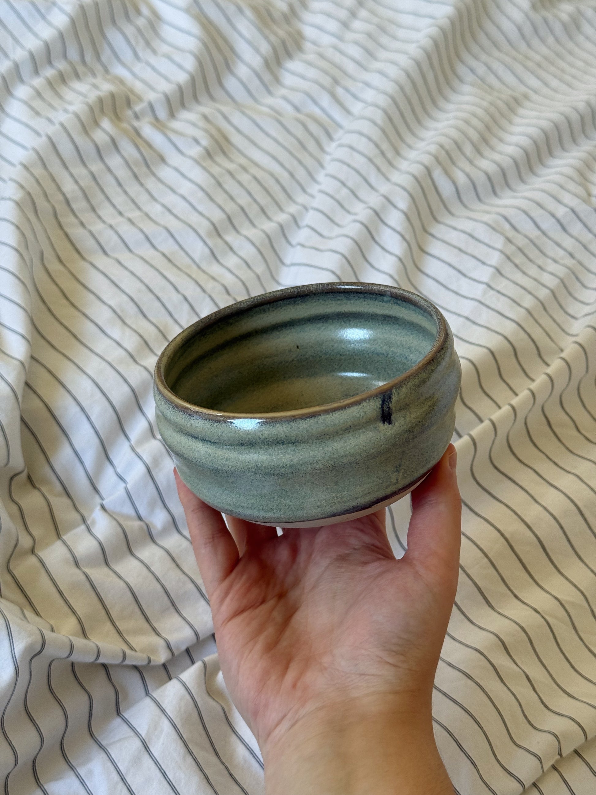 A matcha bowl finished in the Ocean Eyes glaze, a serene blend of blue and beige tones. With its smooth, rounded form, it’s perfect for whisking matcha or serving as a breakfast bowl.